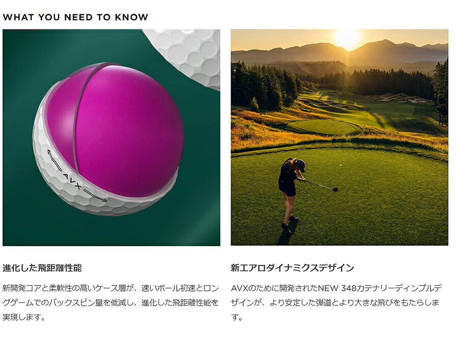 NEW タイトリスト AVXは、進化した飛距離性能とグリーン周りでのスピンコントロール性能の向上に加え、さらにソフトな打感を追求して開発されました。