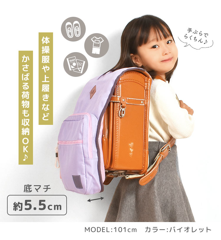 また、非常時にサッとブザーがならせないなど不便がいっぱい・・・ そんなときにおすすめなのが「収納付きランドセルカバー」 上履き、体操着、絵の具セットなどたっぷり入れられます。