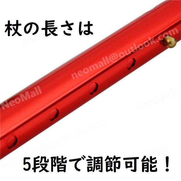 杖の長さは、5段階で調節可能です!【サイズ】 杖の長さ:81〜92cm(5段階で調節可能) 持ち手の長さ:12cm 重さ:約250g【カラー】 レッド ※写真1枚目をご覧ください。