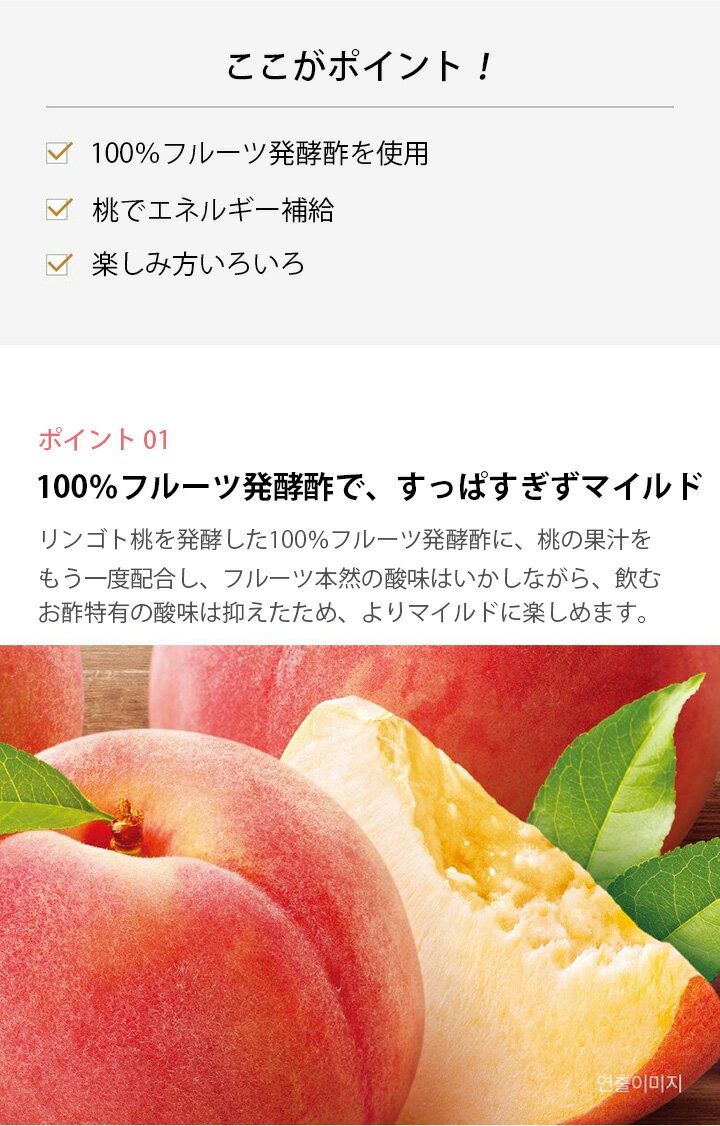 ポイント01 リンゴト桃を発酵した100%フルーツ発酵酢に、桃の果汁を もう一度配合し、フルーツ本然のすっぱさは生かし、 飲むお酢特有のすっぱさは減らし、よりマイルドに楽しめます。