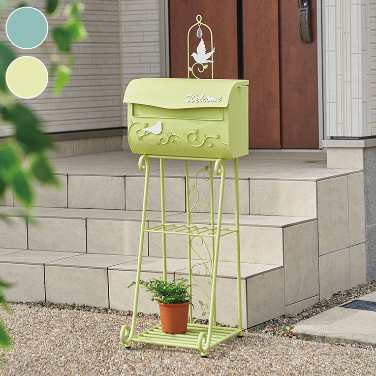 ポスト natural Garden ブルー グリーン 郵便受け 新聞受け 鍵付き 棚付き プランターラック付き エレガント フレンチ 洋風 上品 高級感 自立式 置き形 送料無料