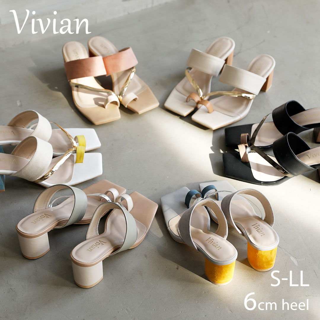 【21日9:59まで延長★全品20%OFFクーポン】22年春夏再販 Vivian サンダル レディース ミュール トング スクエアトゥ チャンキーヒール 太ヒール ブラック 黒 アイボリー 白 ベージュ イエロー グレー グリーン 大きいサイズ 小さいサイズ V0659SM