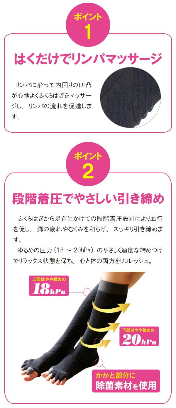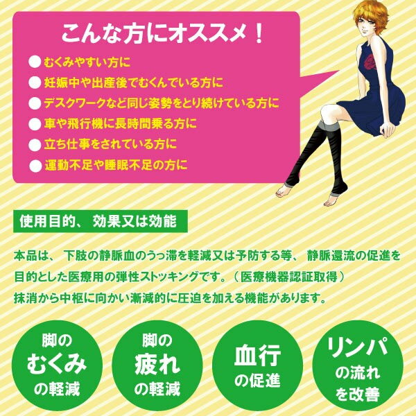 むくみやすい方の強い味方!運動不足や睡眠不足の時のむくみや、妊娠中や出産後のむくみにも効果的!また、車や飛行機の長時間の乗車や、立ち仕事、デスクワークなどの同じ姿勢をとり続けている方にもオススメです! 特徴 【機能性】 抹消から中枢に向かい漸減的に圧迫を加える機能があり、静脈血のうっ血を軽減・予防し、静脈還流を促進します。